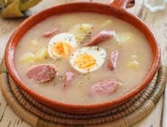 Zupa fasolowa z ziemniakami + Kaszanka z cebulką, ziemniaki i surówka z kapusty kiszonej -