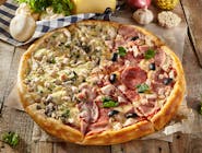 mozzarella, mozzarella di bufala, salami picante, pepperoni, czarne oliwki, suszone pomidory, bazylia -