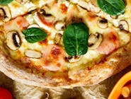 mozzarella, szynka parmeńska, suszone pomidory, parmezan, czarne oliwki, rukola -